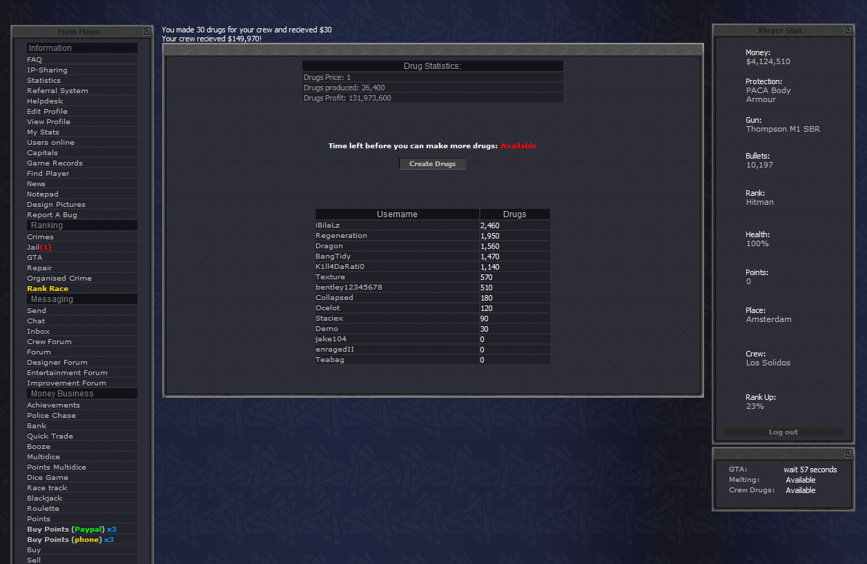 In this gangster mmorpg and mafia game you can make a crew of your own and control all the people in it, Fight with other crews or wipe them to get the top slot! Get your self a few bodyguards or Miletry Vest to protect your self, or get a AK-47 and kill who you hate.