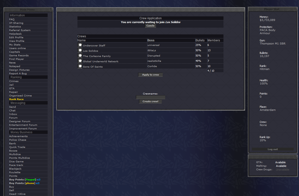 In this gangster mmorpg and mafia game you can make a crew of your own and control all the people in it, Fight with other crews or wipe them to get the top slot! Get your self a few bodyguards or Miletry Vest to protect your self, or get a AK-47 and kill who you hate.